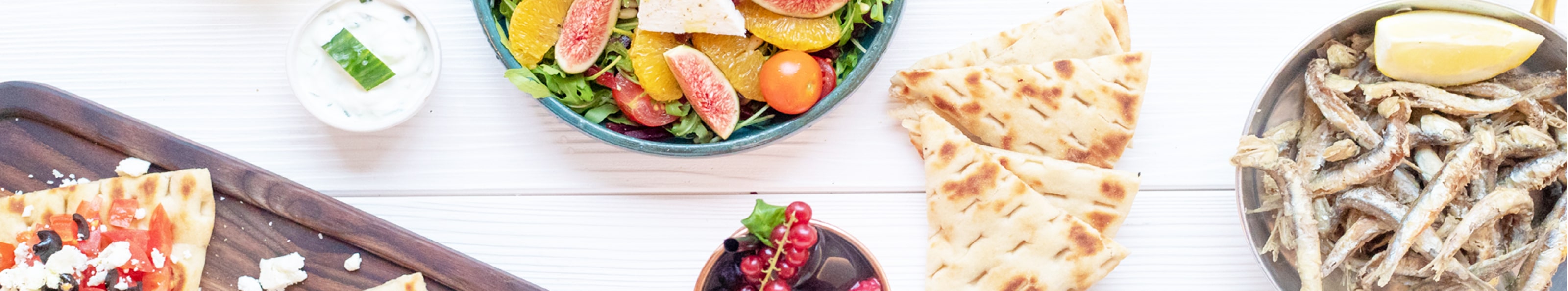 Halloumi Sticks, Pitabrot, Tzatziki und eine Beilage nach Wahl